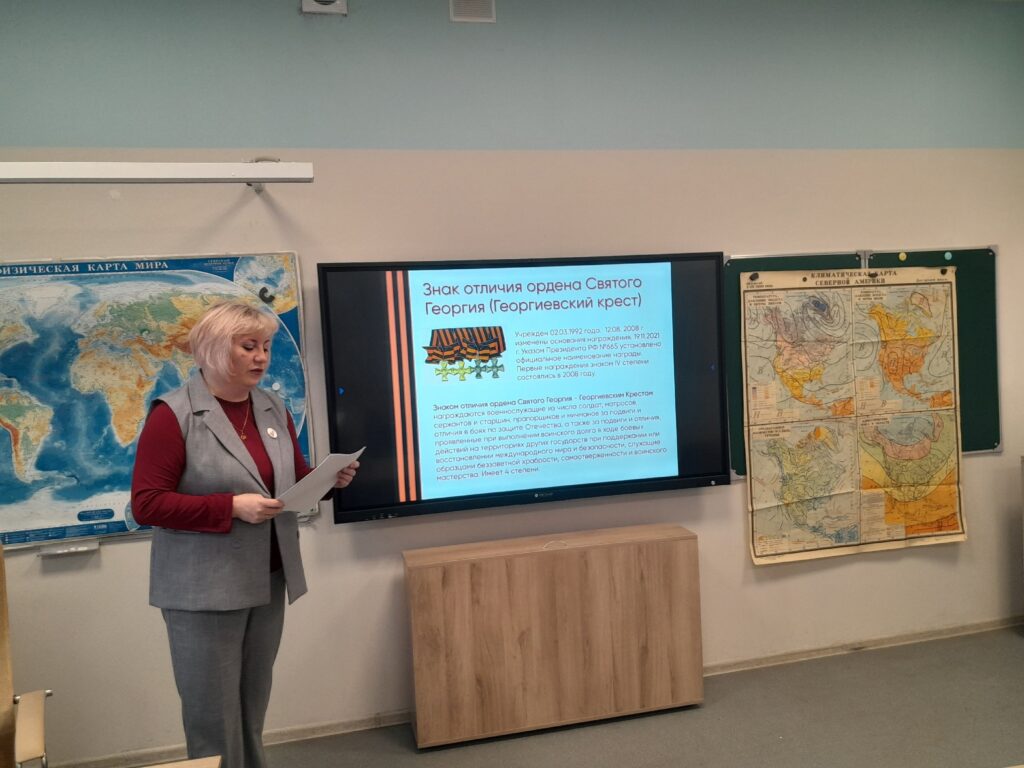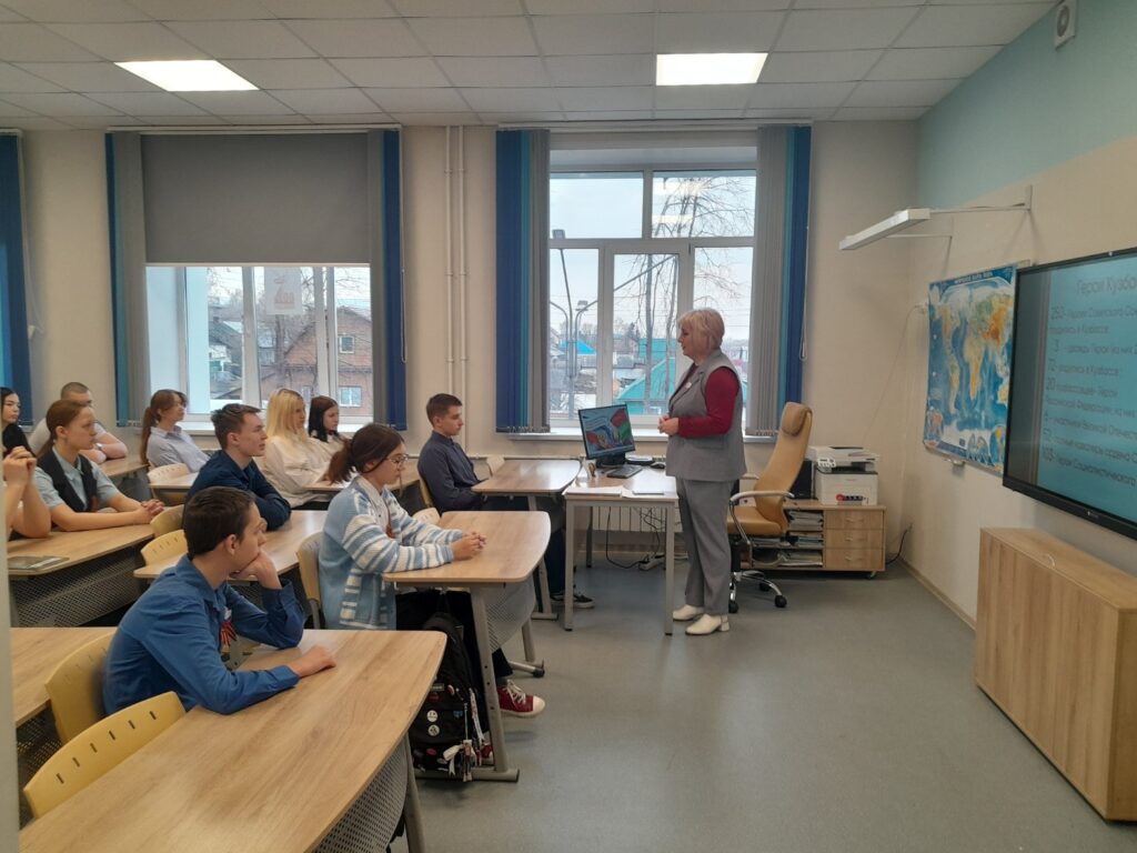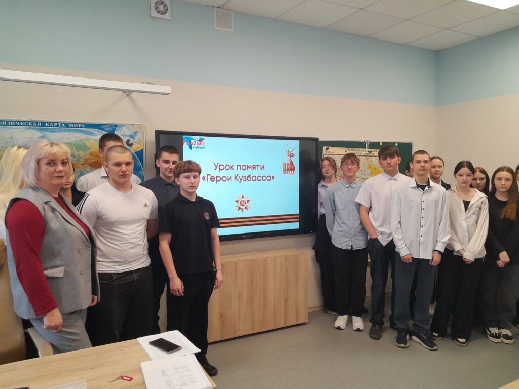 Приближается знаменательная дата – 80-летие со дня Великой Победы. В преддверии этой  даты в  девятых классах депутатом И.В. Опенкиной был организован  урок памяти «Герои Кузбасса». Ирина Валерьевна рассказала о трагических событиях в годы Великой Отечественной войны, о воинах – героях Кузбасса, героях труда. Для школьников была подготовлена информация о государственных наградах:  орден Славы, орден Великой Отечественной войны, знак отличия  ордена Святого Георгия (Георгиевский крест).  Ирина Валерьевна напомнила о традиции – носить Георгиевскую ленточку, как символ памяти о воинах, погибших при защите Отечества, и выражение уважения к ветеранам.