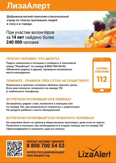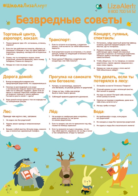 Добровольческим поисково-спасательным отрядом по поиску пропавших детей “ЛизаАлерт разработаны памятки для детей и взрослых по действиям, если потерялся.